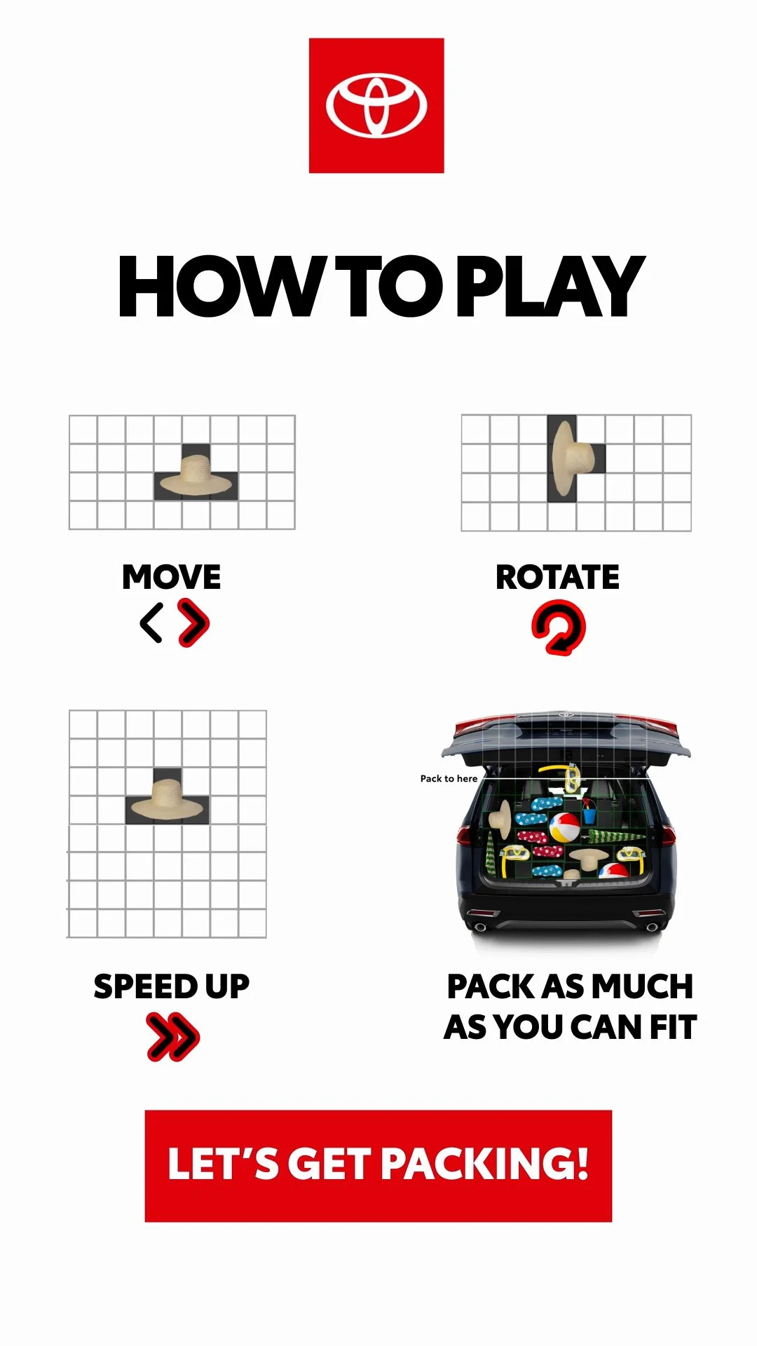 Toyota sought to generate excitement for their new 2024 Grand Highlander, with an emphasis on family adventures and "Grand" experiences. We developed the Cargo Cram Challenge, an interactive game showcasing the vehicle's storage capacity inspired by Tetris. Additionally, we curated the "Home for the Holidays" editorial series, featuring recipes tailored for holiday family gatherings.
